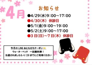 こんにちは。さんだん花ガーデン整骨院から4月のおしらせです。